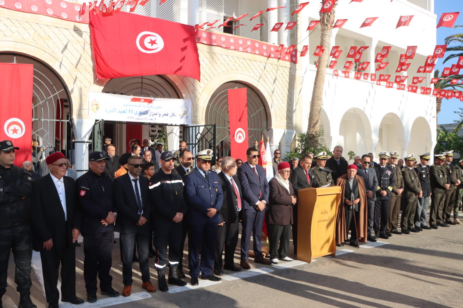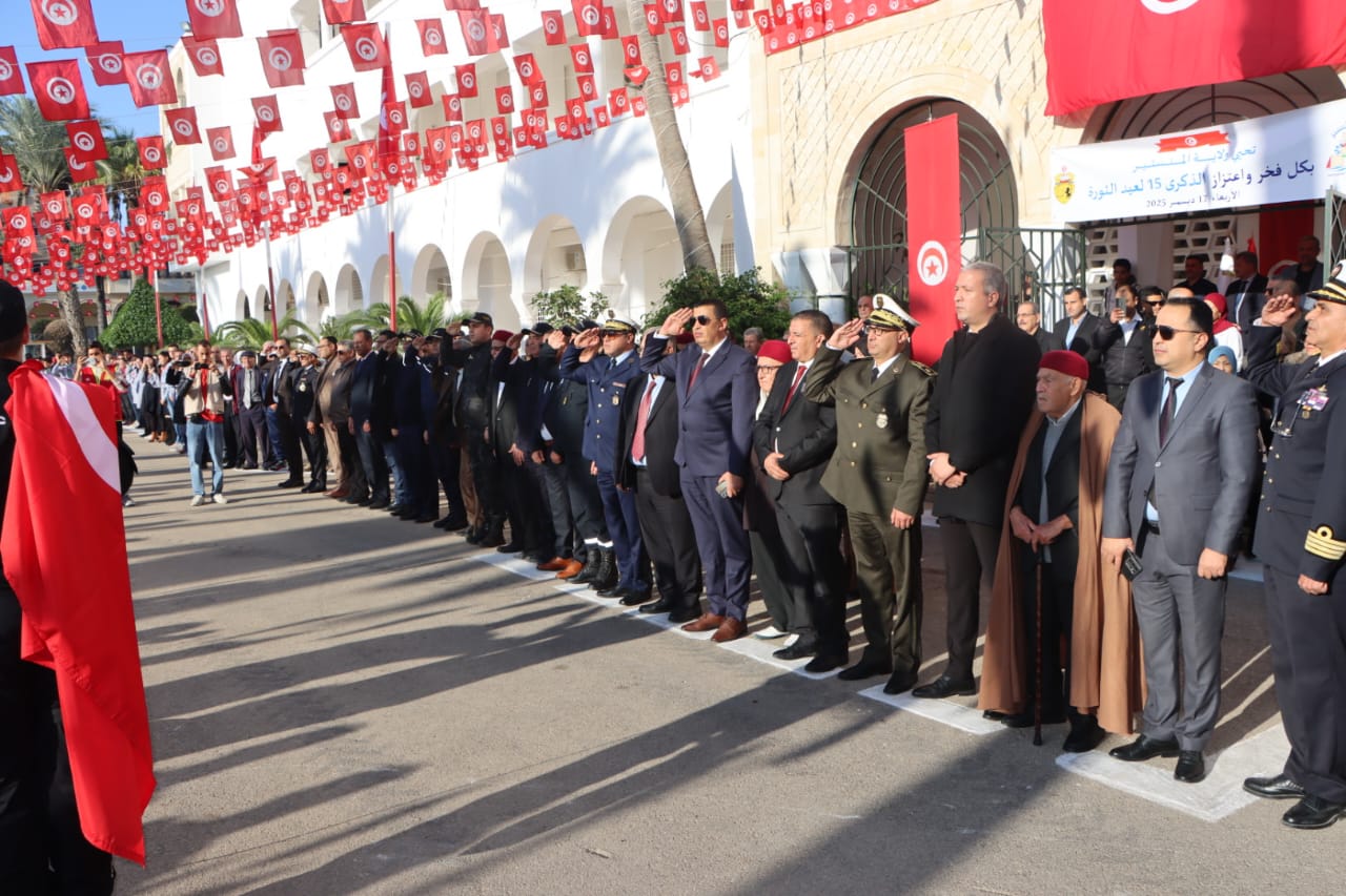 أشرف السيّد عيسى موسى والي المنستير يوم الأربعاء 17 ديسمبر 2025، بمناسبة الاحتفال بالذكرى 15 لعيد ثورة 17 ديسمبر، على موكب لتحية العلم على أنغام النشيد الوطني، بحضور تشكيلات من قواتنا الأمنية والعسكرية.